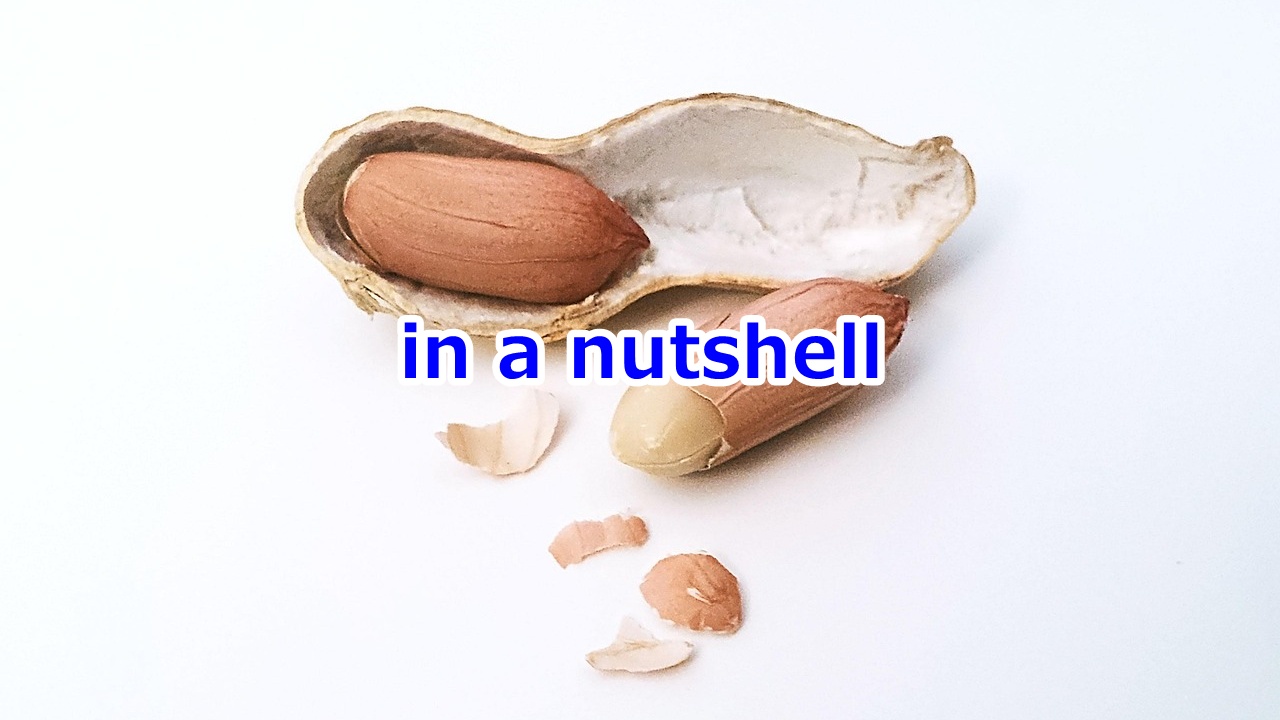 in a nutshellは「要点だけをまとめて伝えると」「ひとことで言えば」 という意味のフレーズです。直訳すると「ナッツの殻の中」という意味ですが、言っていることは「非常に小さな空間に収まるほど短く簡潔に」ということなのです。