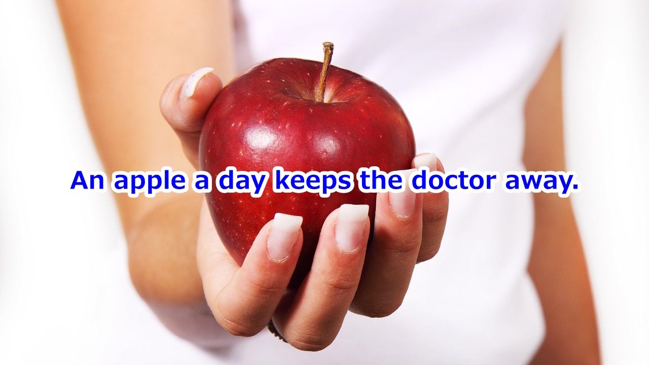 An apple a day keeps the doctor away.は「一日一個のリンゴで医者いらず」「健康的な食生活を続ければ、病気を防ぐことができる」という意味の、英語のことわざ(proverb)です。