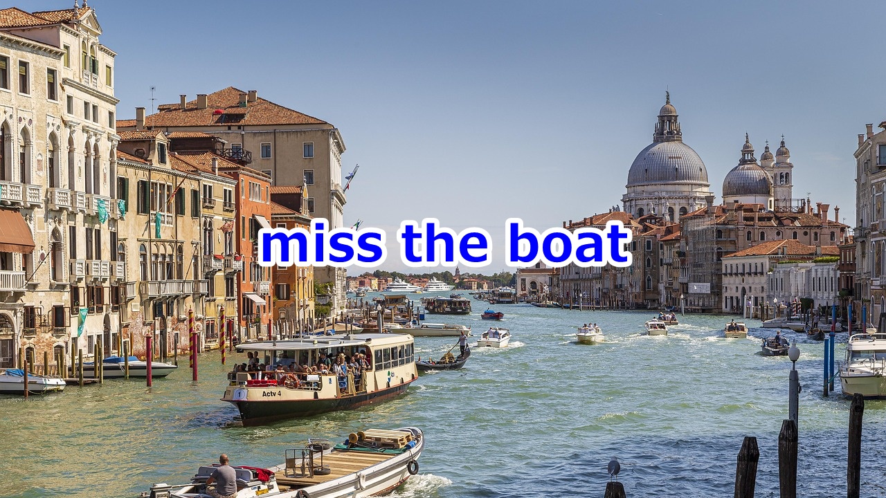 miss the boatは「チャンスを逃す」「手遅れになる」という意味の定形表現です。ある機会を逃した、時機を逸したという意味でビジネスから日常会話まで幅広く使われます。