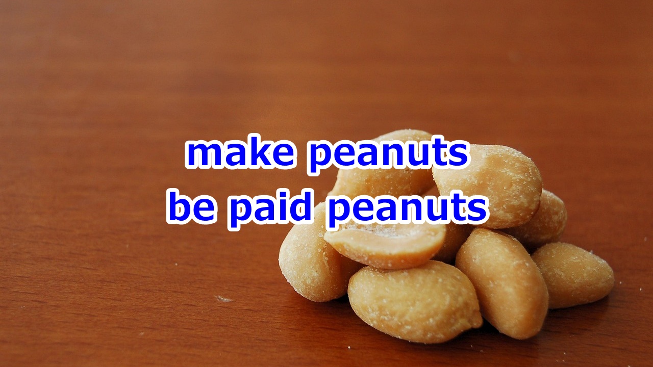peanutsは、もちろん「ピーナッツ」ですが、比喩的に用いられると「ごくわずかな額」「取るに足りない金額」の意味になります。したがって、make peanutsは「ごくわずかな額を稼ぐ」「わずかな収入しか得られない」、 be paid peanutsは「わずかな額しか支払われない」という意味になります。