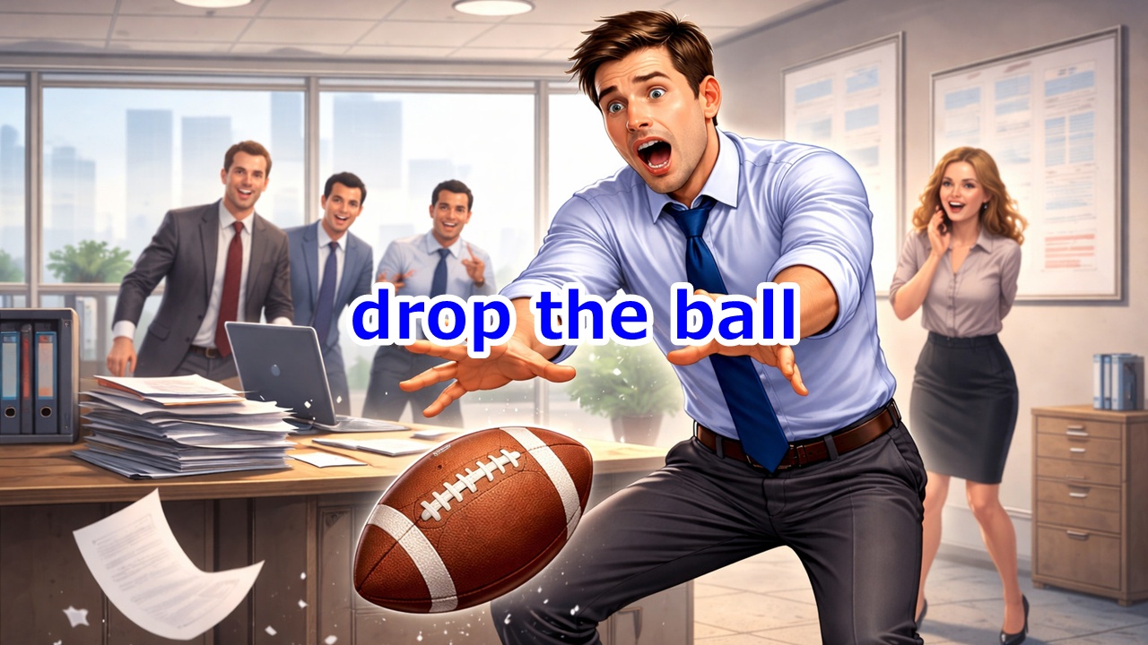直訳すると「ボールを落とす」で、由来はアメリカンフットボールです。キャッチすべきボールを落としてしまうと、チームにとって大打撃となります。「キャッチしていれば勝てたのに!」と、単なるヘマではなく、「大切なところで」「不注意のせいで」という、判断ミスや対応の不足といった意味合いが含んでいます。