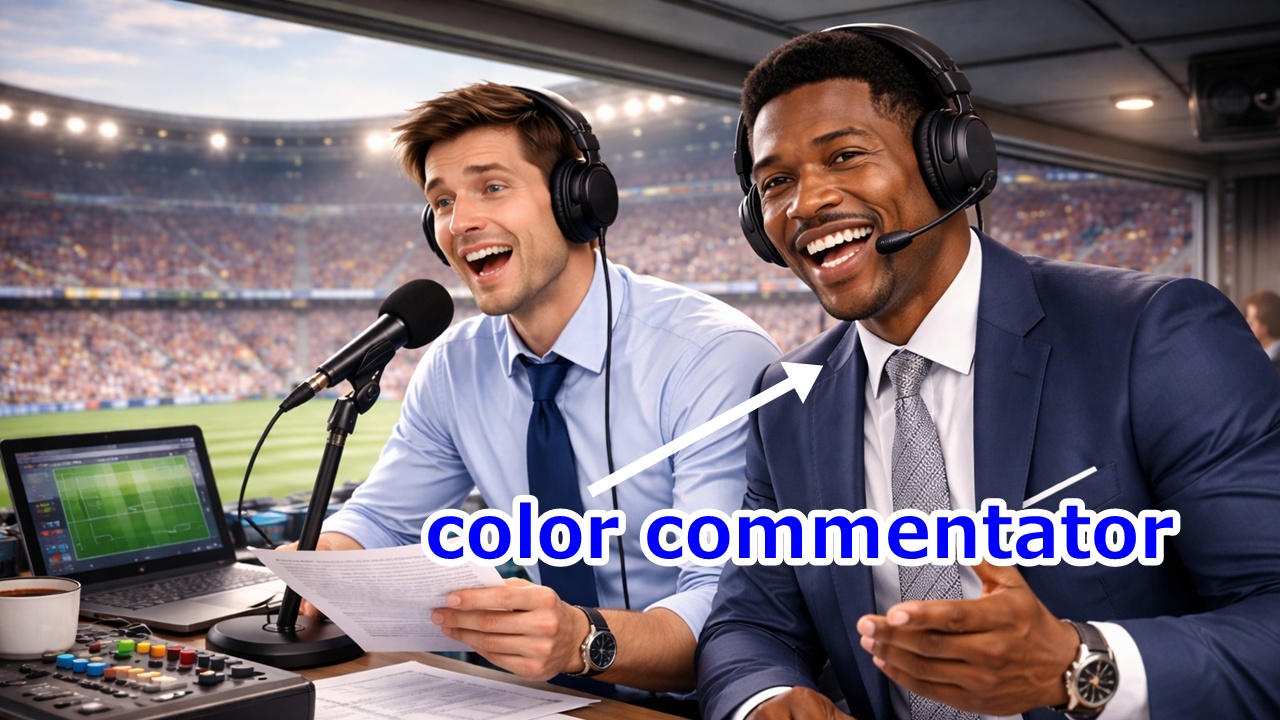 スポーツ中継では、事実や進行を淡々と伝える実況アナウンサー(play-by-play announcer)と、分析や評価、逸話を語るcolor commentatorという役割分担があるのが一般的です。color commentatorは、元選手や元監督であることも多く、専門的視点や経験談が期待できます。