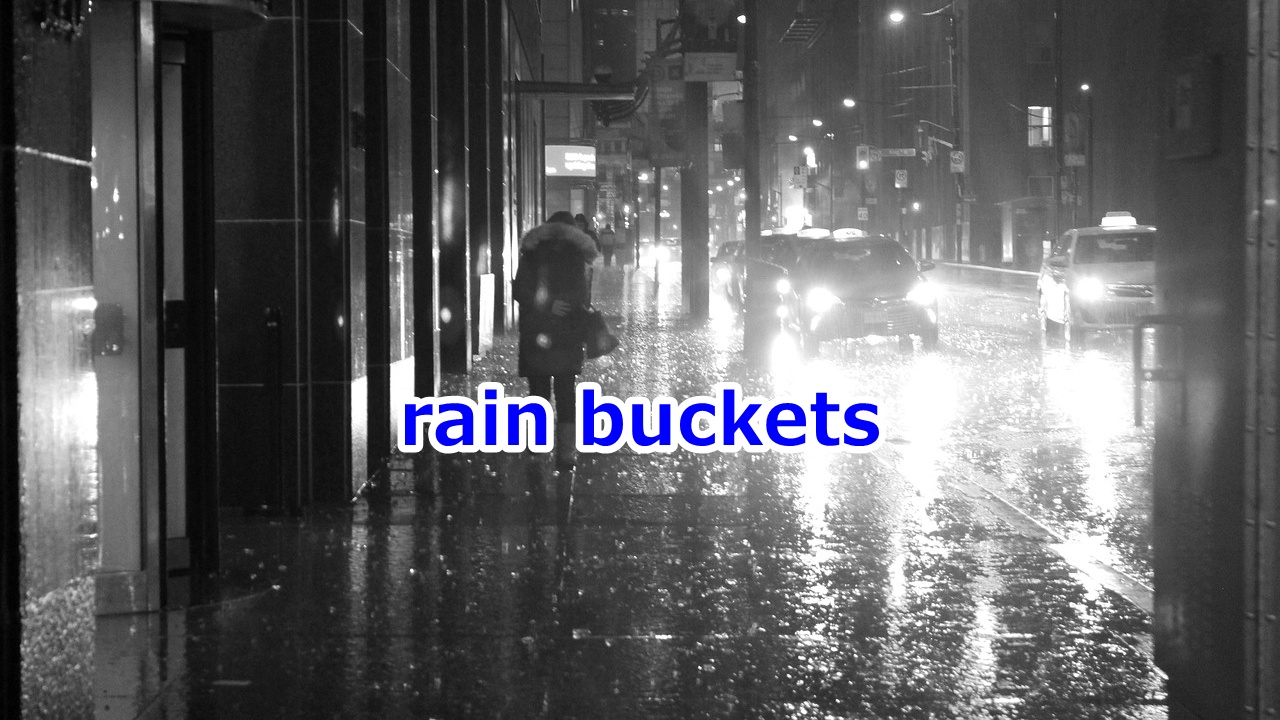 rain buckets (またはrain in buckets) は「土砂降りの雨が降る、バケツをひっくり返したような雨が降る」という意味の動詞フレーズです。動詞rain (雨が降る) に、buckets (バケツ) を加えた口語表現ですが、このフレーズではbucketsと複数形で用います。バケツひとつでは大雨のイメージにならないから、と覚えておくとよいでしょう。
