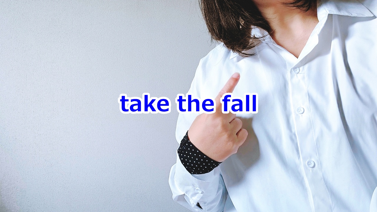 ここでのfallは、失脚、失職、有罪判決といった結果を意味しています。そのfallを自ら、あるいは強制的に引き受ける(take)ことから、身代わりになって罰を受けるという意味になりました。