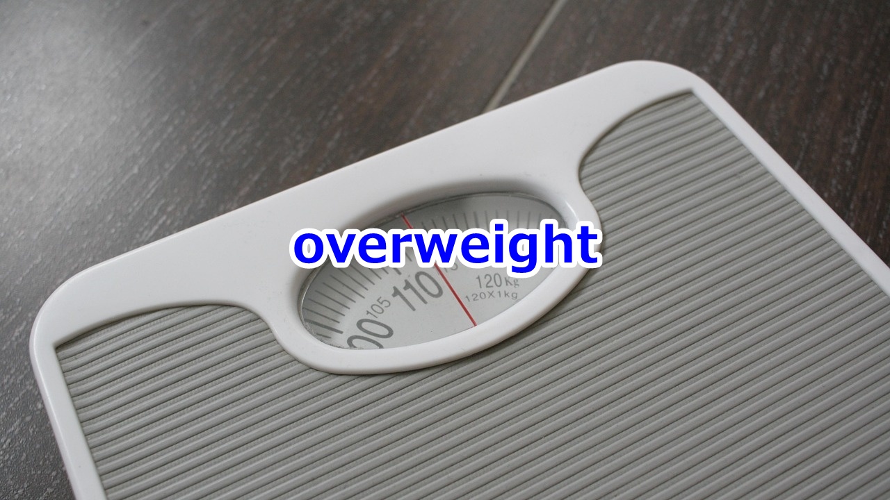 overweightは「重量・体重超過の、標準体重を超えている、太り過ぎの」という意味の形容詞です。over (超えている) + weight (重さ) から成り立っているので、わかりやすいですね。人間だけでなく荷物の重量が規定を超えている場合にも使われます。
