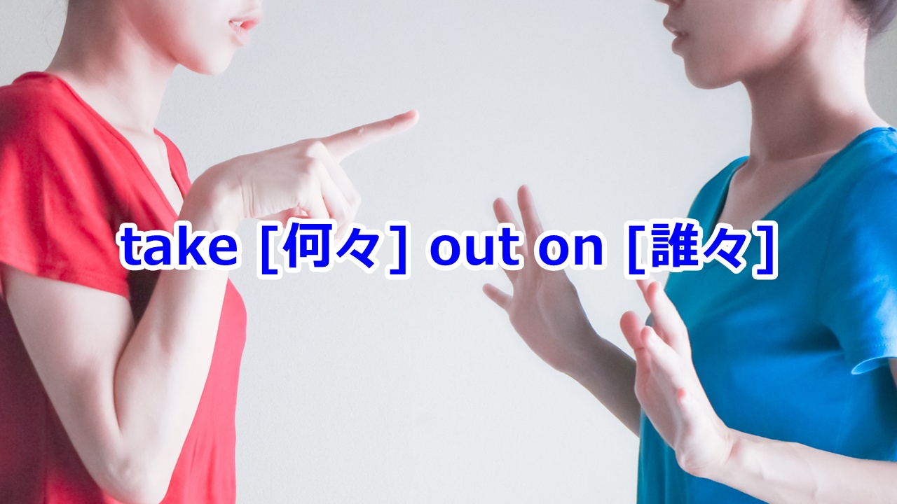 take [何々] out on [誰々] は「~のことで…に八つ当たりする」「(怒りや不満を)…にぶつける」という意味の定形フレーズです。