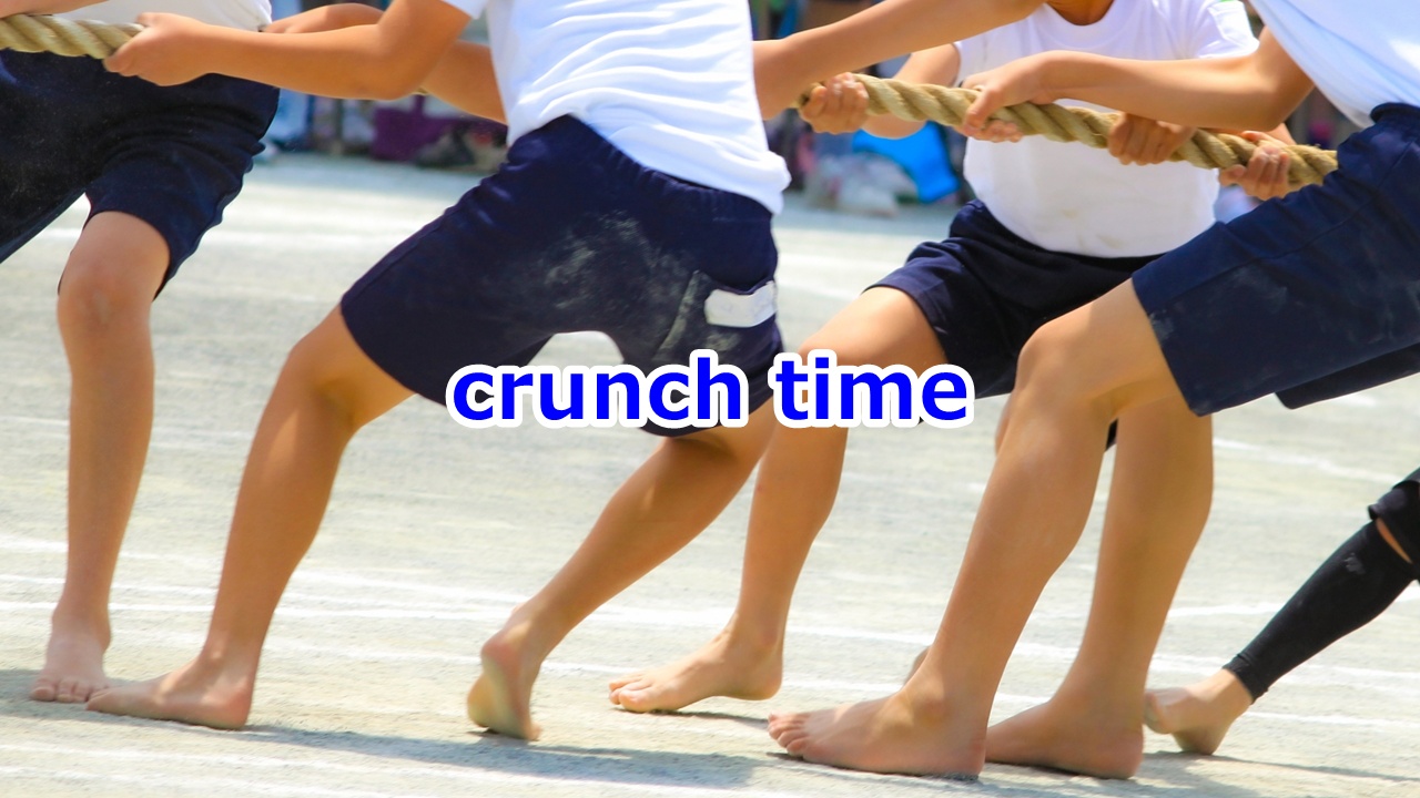 crunch time 正念場、踏ん張り時 更新日:2026年3月3日 公開日:2022年2月5日 定形表現または比喩 ■crunch time プロジェクトの締め切り直前、試合の最終局面、逃げられない勝負の時。 ■今日のフレーズ crunch time 正念場、踏ん張り時 ■例文 (1) The exam is tomorrow and […] 続きを読む