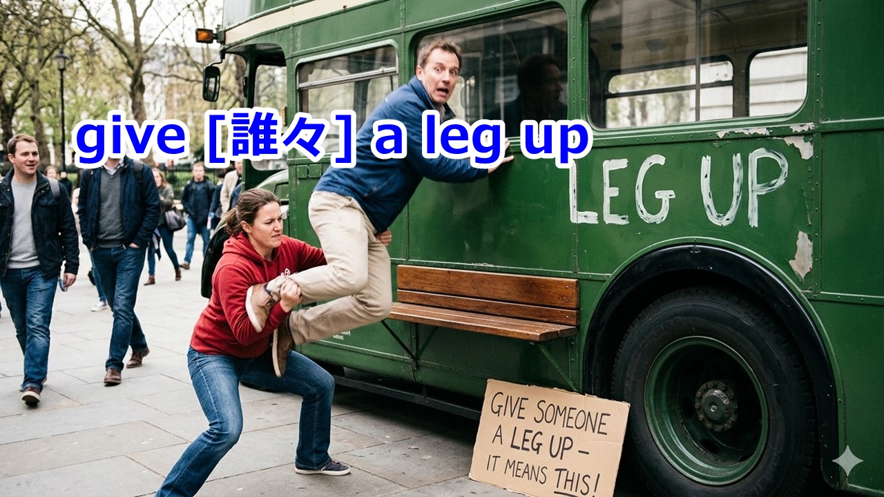 give [誰々] a leg up …の助けとなる 公開日:2026年4月19日 定形表現または比喩 ■その一歩を、強力にバックアップ! 高い壁を乗り越えようとするとき、誰かに「よいしょ」と持ち上げてもらった経験はありませんか? ■今日の英語フレーズ give [誰々] a leg up …を手助けする、…の助けとなる […] 続きを読む