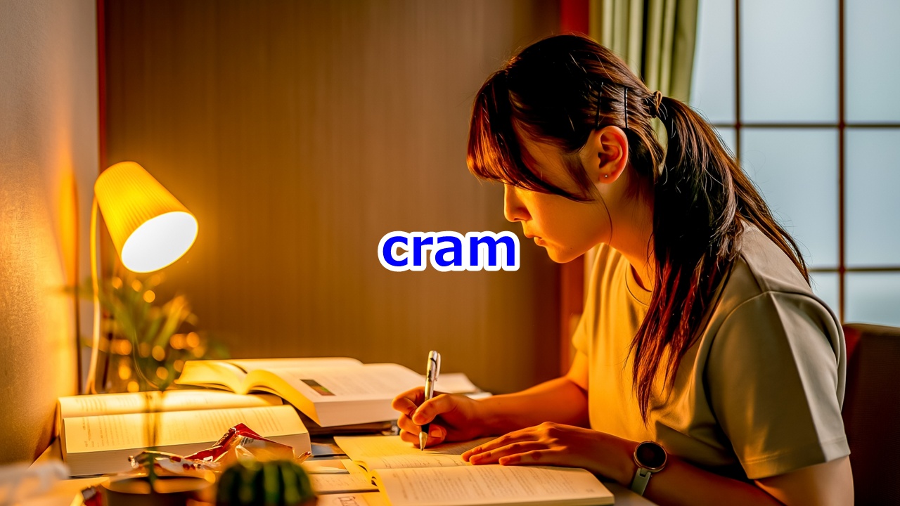 cram 一夜漬けする、詰め込む、押し込む 公開日:2026年4月23日 一般表現 ■試験前夜だけは熱心? 余裕のない場所に物を詰め込む様子です。 ■今日の英語フレーズ cram 一夜漬けをする、試験直前に詰め込み勉強をする 無理に詰め込む、押し込む (場所が)人でいっぱいになる、ひしめく Ǵ […] 続きを読む